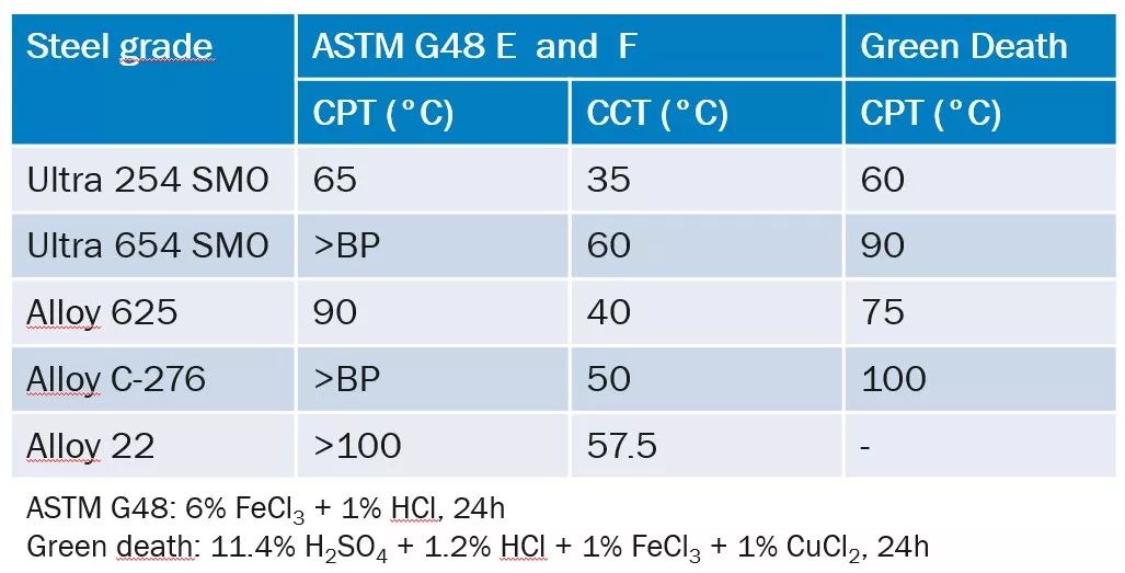 通過ASTM G48的測試,Ultra 654SMO的臨界點腐蝕溫度(CPT)和縫隙腐蝕溫度(CCT),跟鎳基合金Alloy C276和Alloy 22相當。