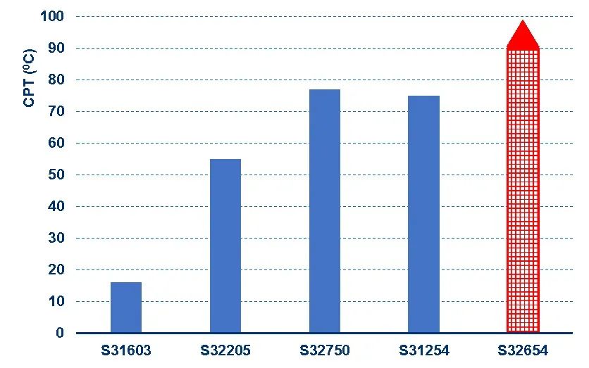 ·        第二代超級奧氏體不銹鋼(Ultra 654 SMO)的耐局部腐蝕的能力優越于第一代超級不銹鋼,而與鎳基合金,如UNS N10276,相同。