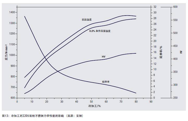 由于雙相不銹鋼較高的硬度和加工硬化率,與標準奧氏體不銹鋼相比,它降低了機加工操作中工具的壽命或需要更多的機加工次數。在成型或彎曲操作之間可能需要退火,因為雙相不銹鋼的塑性差不多是奧氏體不銹鋼的一半。冷加工對2205雙相不銹鋼力學性能的影響見圖13。