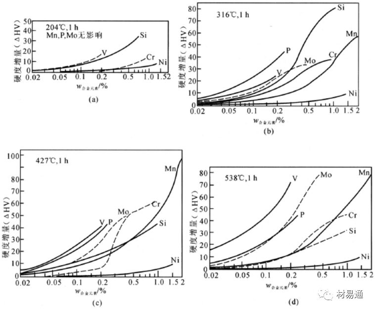 此外,鎳和磷引起的硬度增量在所有回火溫度下都是同一值,這說明其作用只是固溶強化,而與回火轉變無關。但鉻和錳引起的硬度增量隨回火溫度變化較大,這說明它們對碳化物轉變的各個階段都有一定影響。