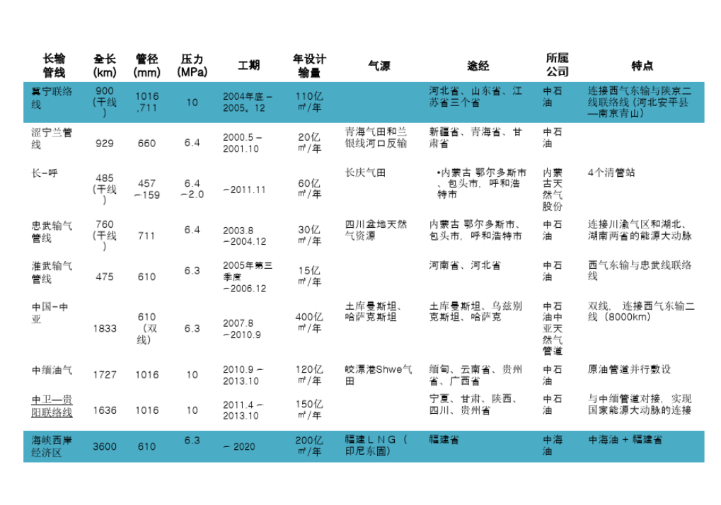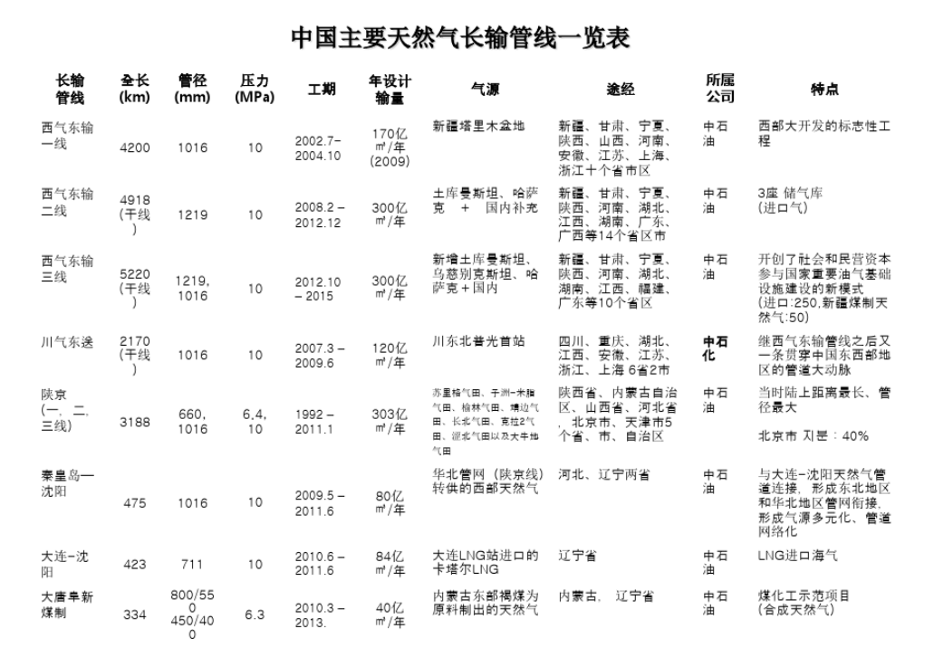 我國主要天然氣長輸管線情況