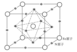 氮的原子半徑(0.075nm)比較小(Fe 0.172nm),較容易侵入母相晶格的間隙中,在鋼中形成間隙式固溶體,導致晶格產生畸變,其影響遠遠大于置換式固溶原子。在體心立方結構的α-Fe中,氮原子侵入八面體中的位置如圖1所示,為bcc單位晶胞各棱的中央和各面的中心位置。在α-Fe中通過間隙型溶質原子的作用,產生了非對稱的應變,具有非常強烈的固溶強化作用。