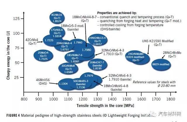 高強度貝氏體鋼有時會通過鍛造熱的受控冷卻獲得更高的強度,同時改善延展性。圖4顯示了幾種貝氏體鋼。在圖5提出了幾種用于具體應用的貝氏體。圖5中的百分比表示與輕量化設計方案相比,系列零件的重量增加了多少。