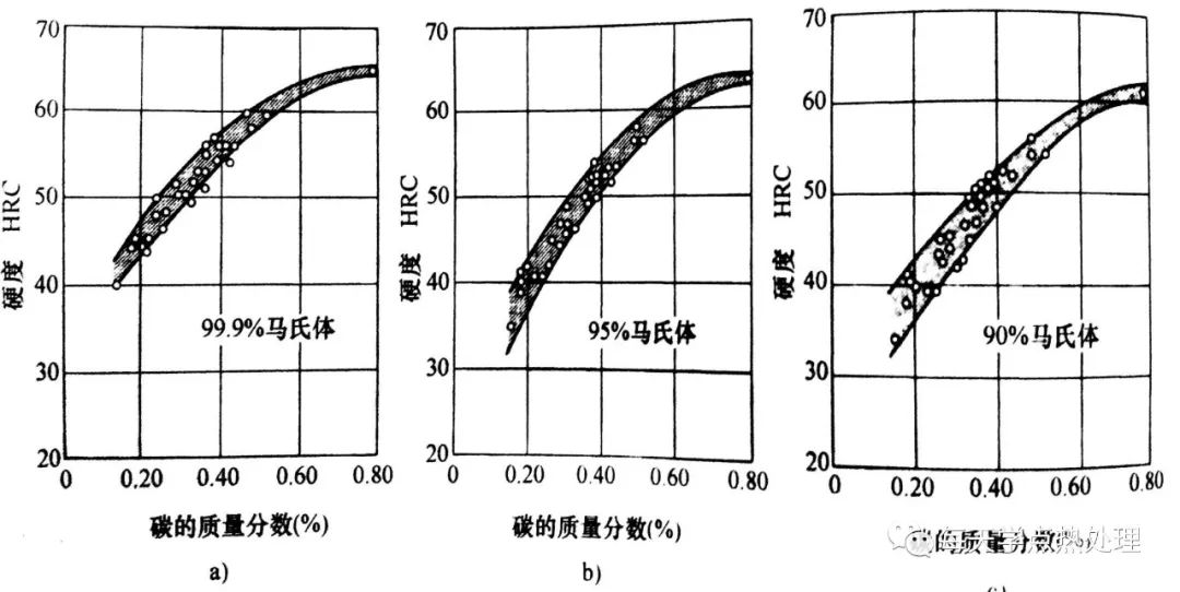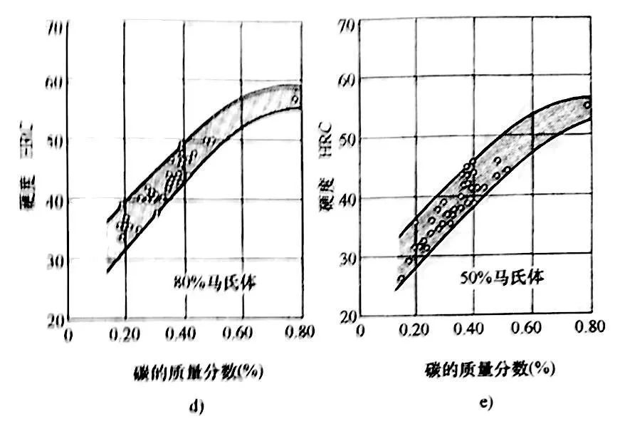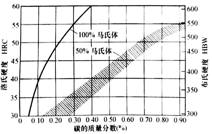 淬透性是衡量淬火能力的一種以試驗為依據的指標,不應該將其與硬度或淬火后馬氏體的最高硬度相混淆。硬度取決于含碳量和馬氏體轉變程度,鋼中不同的含碳量與馬氏體含量對硬度的影響見圖1 和 表1 。