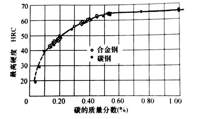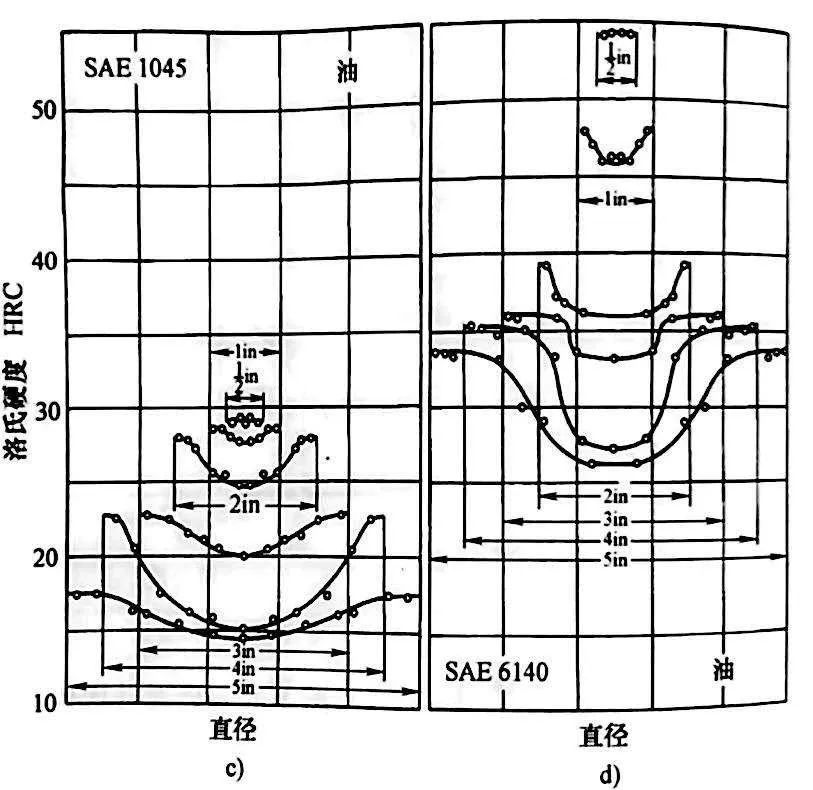 對于一個給定的含碳量,當為100%馬氏體組織時,可達到最大硬度,這種組織只能從表面或小型鋼試樣的薄截面上獲得。大截面上無法達到足夠大的冷卻速度,從而無法完成100%馬氏體轉變,因此零件的馬氏體層深度和硬度會降低。