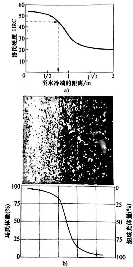 喬米尼(Jominy) 和伯格霍爾德(Boegehold) 首先用滲碳鋼做了喬米尼末端淬火試驗,不久之后,喬米尼將該試驗應用在廠評估中碳鋼的容透件喬米尼末端淬火試驗已經形成了標準,即1S0642、ASTM A255 和 SAE J406,我國標準GB/T225-2006。試驗圓棒的尺寸通常是直徑25mm (1in) 、長 100mm (4in) , 一端帶有法蘭,用于在淬火時夾持到夾具上圖5 a)。有時根據需要,試驗圓棒的尺寸會有所改變。試驗過程為先將試樣加熱到適當的奧氏體化溫度,然后將其移到淬火夾具上。淬火夾具是一種專門設計的裝置;試樣垂直夾持在一個水柱噴水口之上13mm (0. 5in) ,水柱能垂直對著試樣底部,見圖5 a) 。當試樣底部被水柱淬火時,另一端在空氣中緩慢冷卻,試樣的中間部位則以中等速度冷卻。在試樣完成淬火之后,在圓柱體兩相對表面磨去0. 38mm (0. 015in) 的深度形成平行面。對于合金鋼,每間隔1. 6mm (1/16in)測量一次硬度(HRC);對于碳鋼,則以間隔 0. 8mm (1/32in) 測量硬度,從水淬端開始測量。