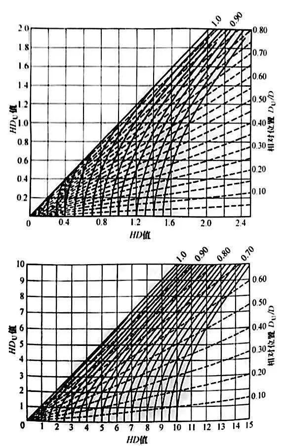 因此,對于圖12專用的一條特性曲線,只需要在圖13中找到其對應的曲線,便可得到HD0 的值,從而得到 H 的值。為此,引入兩種簡便方法,包括已確定的DU/D的斜率,結果,用在兩種適用尺寸上獲得淬火深度,以獨特的方式確定鋼的淬透性(DU/D)和淬冷烈度(傳熱系數 H)。另一種簡便方法,是使用圖14的對數圖。