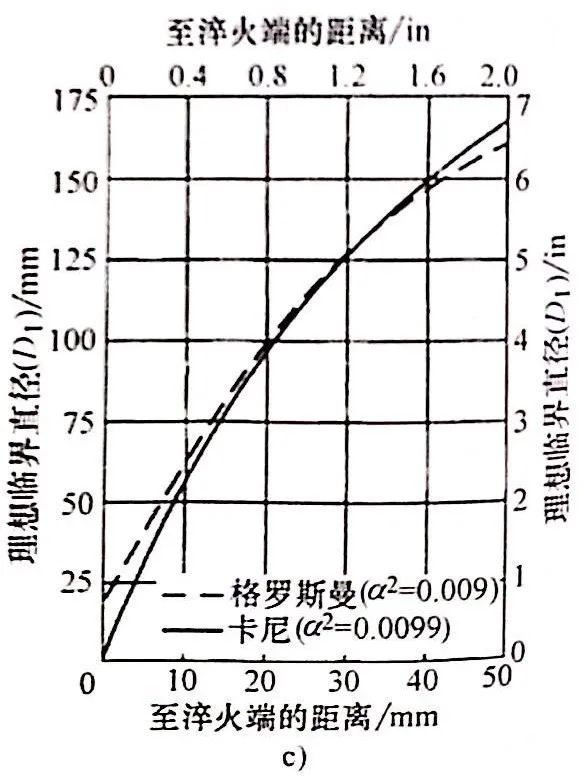 除了可以根據冷卻速度確定淬冷烈度,羅格斯曼等人還研發了另一種以測量不同直徑的圓棒的淬火深度為基礎的方法。在這種方法中,以圓棒末端直徑(DU)與總直徑(D)之比來衡量淬火深度。將末端淬硬直徑DU定義為50%馬氏體組織深度處的直徑,可以測量顯微組織,或者更方便地以硬度來衡量。如果知道含碳量,則可以根據測得的硬度確定50%馬氏體的深度,如圖11所示 。對于50%馬氏體組織,另外50%的硬度,受其他合金化效應的的影響。