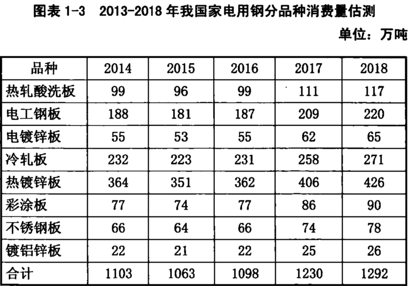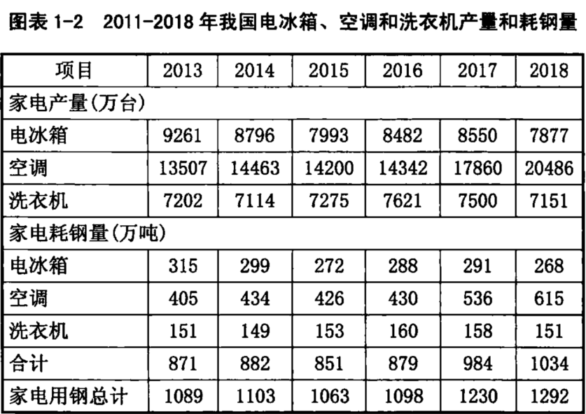 家電行業產品中大家電產品用鋼材約占90% (其中三大白色家電耗鋼量約占整個家電行業總用鋼量的80%),小家電用鋼約占10%,板材則占全部鋼材消耗的95%。2018年,家電行業鋼消費量約為 1292萬噸。