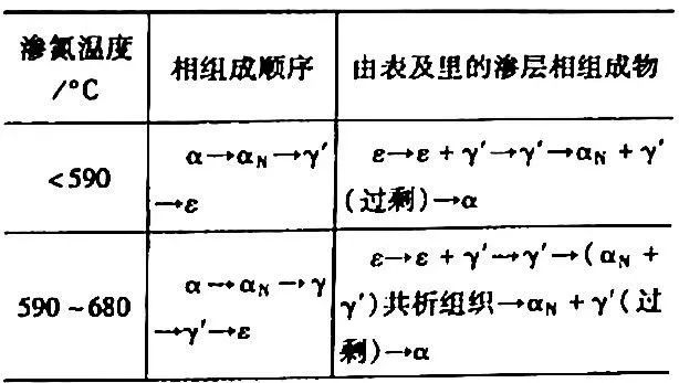氮的滲入過程不同于滲碳,它是一個典型的反應擴散過程,依照Fe-N相圖,不同溫度下,隨著滲氮時間的延長,依次形成的相各有不同。詳見表2 。