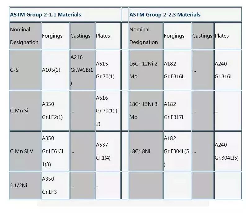 作為舉例,以下是按照ASTM劃分的兩組材料和他們按照ASME B16.5的壓力-溫度額定值。
