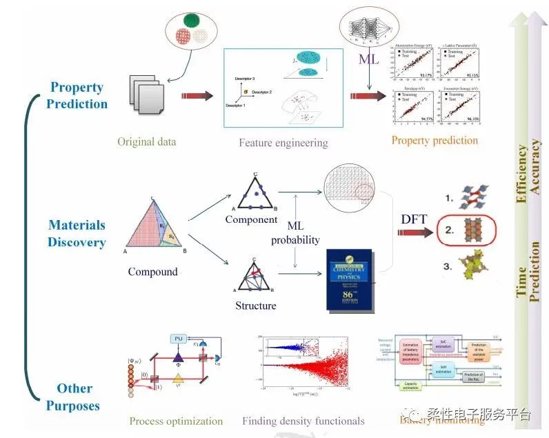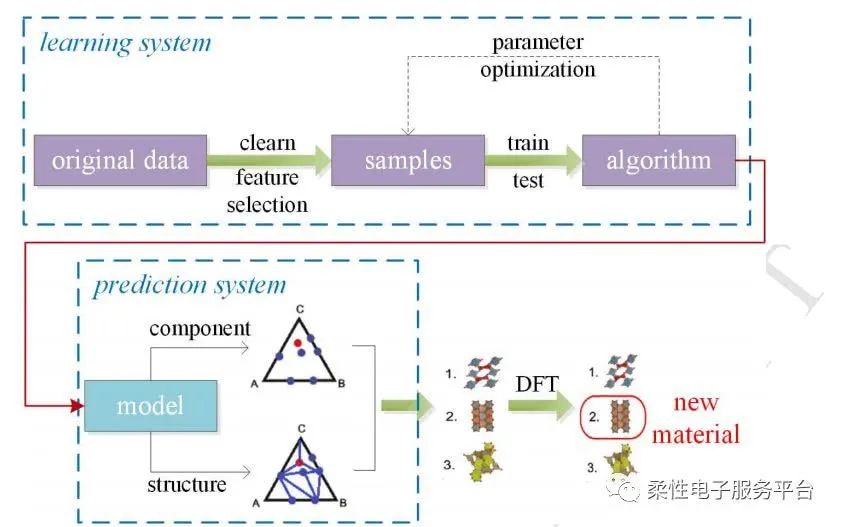 圖7顯示了發現新材料時機器學習的一般過程。用于發現新材料的機器學習系統包括兩個部分,即學習系統和預測系統。學習系統執行數據清理,特征選擇以及模型訓練和測試的操作。預測系統應用從學習系統獲得的模型用于組件和結構預測。通常通過建議和測試方法“預測”新材料:預測系統通過構圖推薦和結構推薦來選擇候選結構,并且使用DFT計算來比較它們的相對穩定性。