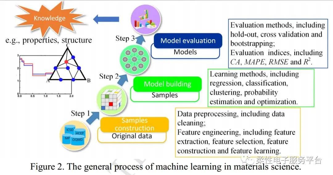 機器學習在高維度數據的分類,擬合以及其他的相關任務中表現出良好的適用性。為了能從大量數據中提取知識并獲得洞察力,機器學習能夠從以前的計算中學習并持續進步,從而能夠產生可靠,可重復的決策和結果,因此在許多領域發揮了重要作用,尤其是語音識別,圖像識別,生物信息學,信息安全和自然語言處理(NLP)。,目前,我們的許多日常活動都是由機器學習算法來提供支持,諸如欺詐監測,網絡搜索,情緒分析,信用評價等。機器學習在材料科學中的開創性應用可以追溯到20世紀90年代,當時主要是采用符號方法和人工神經網絡(ANNs)等機器學習方法來預測陶瓷基復合材料中纖維/基體界面的腐蝕行為,以及拉伸強度等參數。隨后,機器學習已被用于解決材料科學中的各種主題,例如新材料發現和材料特性預測。通常,在使用機器學習來解決材料科學中的給定問題時,應該構建機器學習系統。這種機器學習系統的一般范例如下: