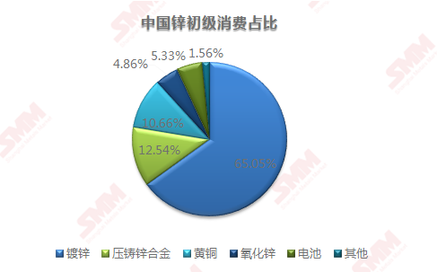鋅在有色金屬行業中占有重要的地位,無論從產業鏈、價格、資源分布等各個方面都是市場關注的焦點。構建鋅錠端的供需平衡,是評估目前市場供需關系最為有效的方式,因此,我們需要對鋅初級消費進行跟蹤。鋅初級消費主要以鍍鋅、壓鑄鋅合金、黃銅、氧化鋅、電池等版塊為主。而鍍鋅是鋅下游消費占比最大的板塊,比例為65.05%。