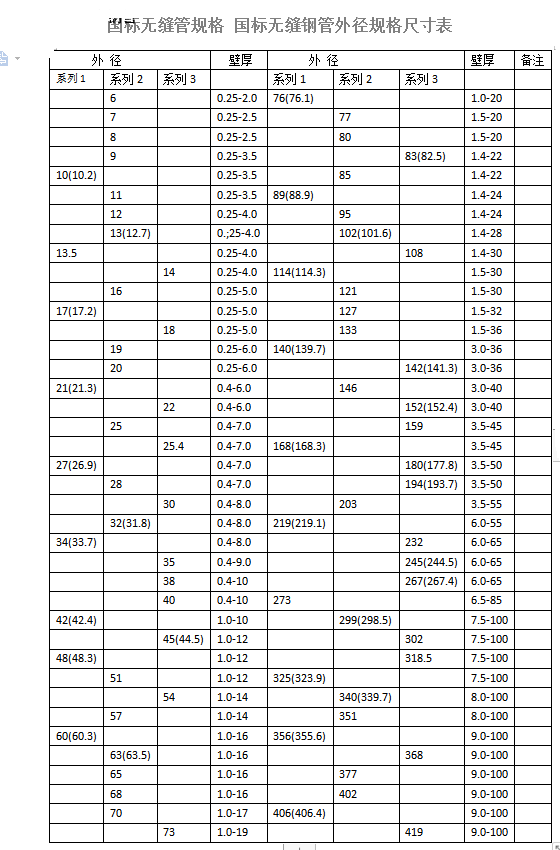 根據中華人民共和國國家質量監督檢驗檢疫總局和中國國家標準化管理委員會聯合發布,于2008年11月1日實施的GB/T17395-2008(無縫鋼管尺寸、外形、重量及允許偏差)規定,無縫管規格如下,單位:mm。