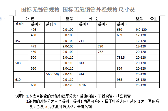 圖中說明:本表中鋼管外徑和壁厚分為普通鋼管、不銹鋼管、精密鋼管三類;鋼管外徑系列1為通用型,推薦選用,系列2為非通用型,系列3為特殊規格專用型。詳見下圖: