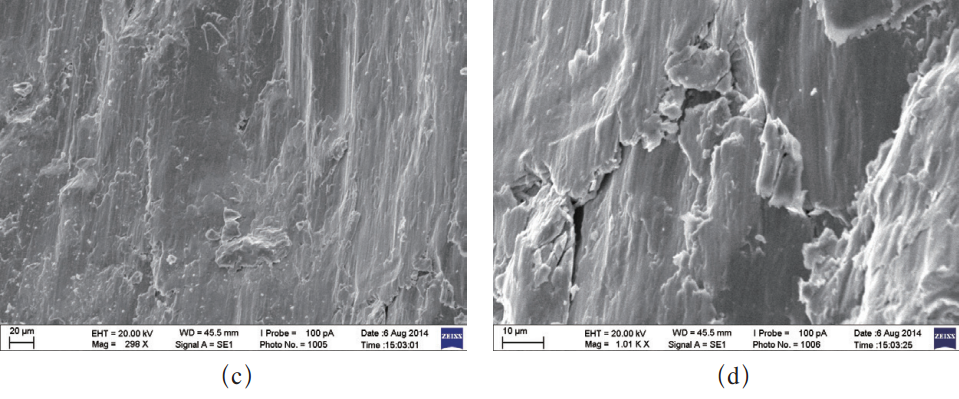 掃描電鏡下觀察,螺紋損傷部位呈擠壓、磨損形貌,可見物質轉移、堆積,損傷表面未見嵌入的外來多余物,螺桿、螺栓損傷區域微觀形貌分別如圖3、圖4所示。
