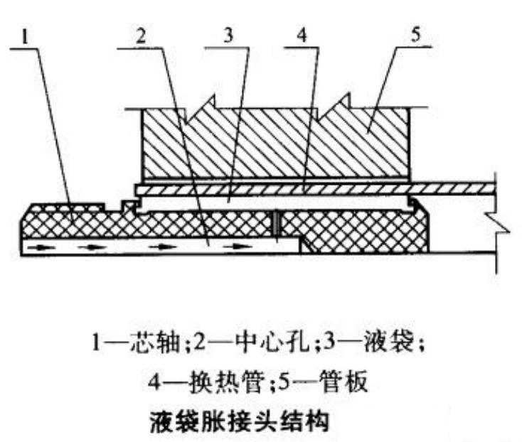 原理:基本原理源于液壓脹接,但為了防止泵液殘留在管內,故在芯軸與換熱管之間加了一個橡膠袋,泵液壓力通過橡膠袋傳遞到換熱管上,具有液壓脹的優點。
