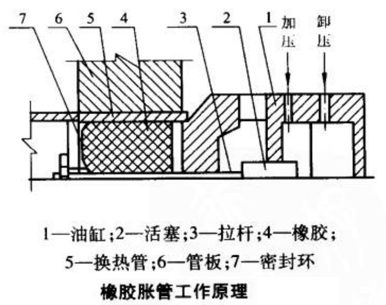 原理:軸向擠壓特種橡膠使橡膠產生徑向擴張力,促使換熱管向外擴張,達到脹接的目的。