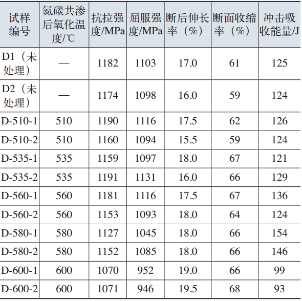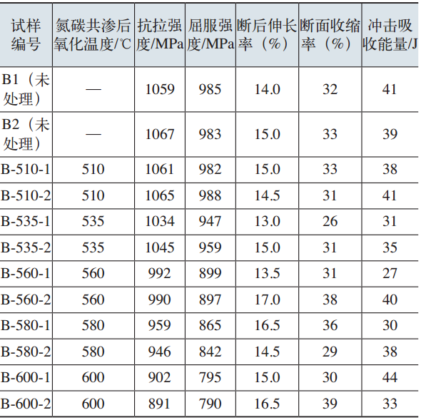 據國外文獻報道,離子氮碳共滲后氧化處理的前提條件是離子氮碳共滲處理后要有較厚的化合物層,這樣才能在后氧化處理過程中獲得致密的Fe3O4層,達到耐蝕目的。氮碳共滲后氧化常用溫度一般不低于560℃,對于高強度工件,采用氮碳共滲后氧化工藝存在降低材料原有強度的可能,因而有必要研究氮碳共滲后氧化對常用鋼力學性能的影響。