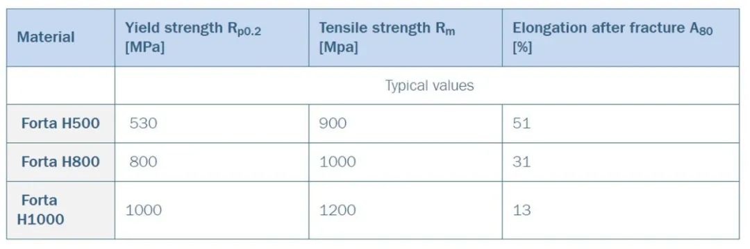奧托昆普生產的TWIP奧氏體不銹鋼主要用錳(Mn)和鉻(Cr)合金化。Forta H系列包括Forta H500,H800和H1000牌號-根據它們的屈服強度命名。這些牌號的特性如圖2和3所示。