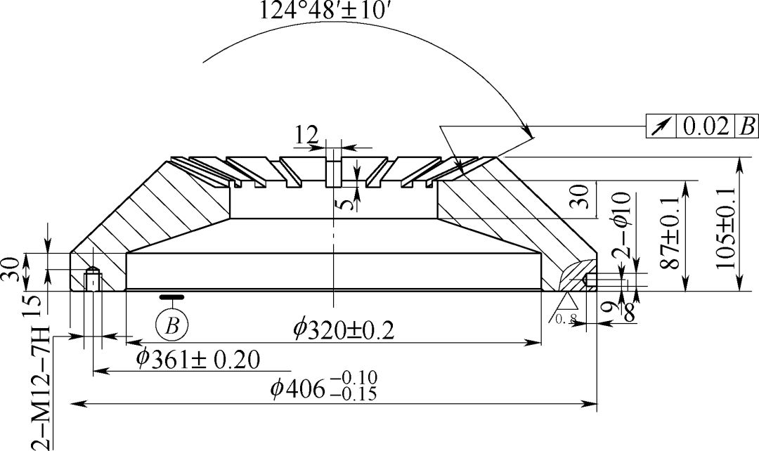 在制作淬火上模的時(shí)候,將淬火上模的內(nèi)腔形狀按照零件的外形進(jìn)行制作,這樣在淬火時(shí)模面能夠壓在零件的表面,限制了零件的變形趨勢(shì);同樣在淬火上模的表面上加工出24條凹槽,以保證淬火油順暢地進(jìn)行流動(dòng)。