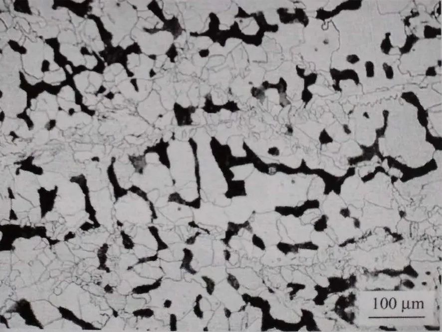 淺磨有缺陷的鋼板板面后進行顯微觀察,缺陷區域除唇狀裂口外,還存在數量頗多的微裂紋,裂紋內嵌有氧化鐵,形狀多呈網角狀和蚯蚓狀(圖1-63) 。經試劑浸蝕后,缺陷區域出現數量較多的粗大餅形先共析鐵素體,在裂口的一側組織流變較嚴重(圖1-64右側),正常部位組織為晶粒細小的針狀鐵素體,見圖1-65。