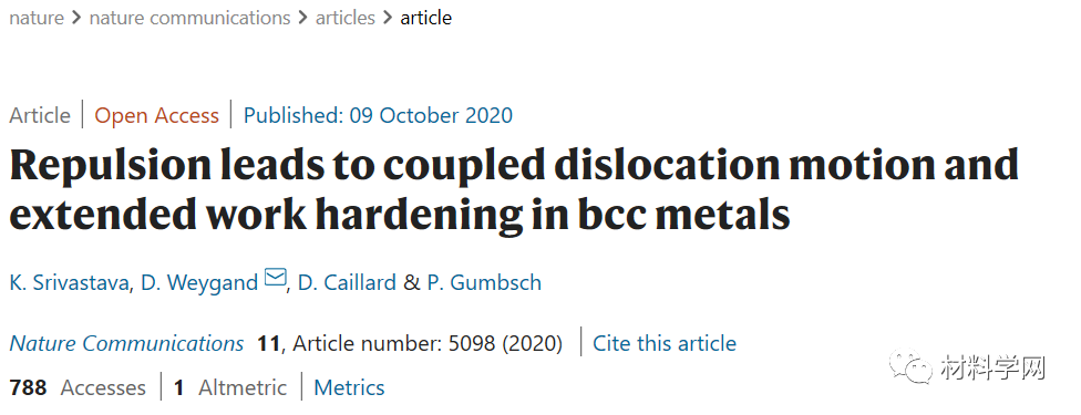 基于此,本文使用離散位錯動力學(DDD)模擬和原位實驗系統地研究了bcc金屬中螺型位錯的相互作用,排斥性導向的螺型位錯在沒有附加施加應力的情況下共同滑動,而不是阻礙移動的螺釘錯位的運動,這可能有助于更好地理解高變形bcc金屬延展性的增加。相關研究結果以題為“Repulsion leads to coupled dislocation motion and extended work hardening in bcc metals”發表在Nature communication上。