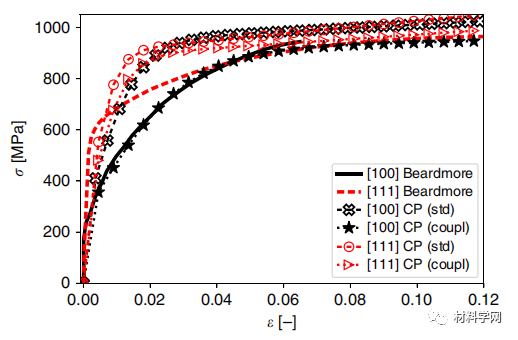圖4.鎢單晶在[100]和[111]加載方向上的變形行為