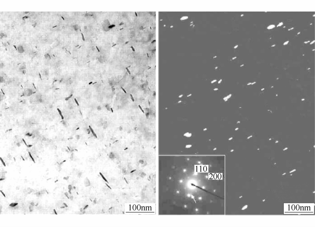 當鋼中含釩量達到一定數量時,將產生明顯的二次硬化作用。如圖1所示,約在550~650℃溫度范圍,含釩鋼在回火軟化過程中存在一個二次硬化峰。釩的碳化物的大量析出是產生二次硬化的主要原因。 圖1 釩鋼回火過程中的二次硬化 回火過程中析出的碳化釩通常是V4C3,并不是理想配比的VC。位錯線上非均勻形核析出是回火過程中V4C3析出的主要方式。析出相形貌通常也是呈薄片狀,也有呈短桿狀或圓片狀,如圖2、圖3所示。 圖2 回火過程中V4C3析出相形貌 鋼成分:0.10%C-2.00%Mn-1.59%Mo-0.56%V-0.03%Al-0.0044%N,ω(Si)<0.005% 圖3 回火過程中位錯線上析出釩的碳化物