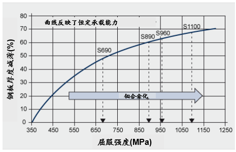 圖1 隨著鋼板屈服強(qiáng)度的增加,鋼板厚度(和重量)減少的潛力