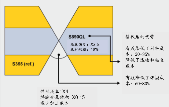 這類應(yīng)用領(lǐng)域采用高強(qiáng)度鋼的目的是為了減小鋼板的規(guī)格厚度,從而減輕重量。當(dāng)要求屈服強(qiáng)度超過約500MPa時(shí),鉬成為中厚板所用鋼種的重要合金元素(是否需要鉬作為合金化元素,還取決于鋼板的規(guī)格和鋼廠的生產(chǎn)設(shè)備)。減輕結(jié)構(gòu)的重量帶來許多好處,包括減少材料消耗(圖1),減少焊接(圖2)以及降低運(yùn)輸和起重成本。這些優(yōu)勢(shì)較好地彌補(bǔ)了鉬合金鋼材料成本的增加。