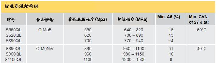 經(jīng)水淬和回火處理的高強(qiáng)度結(jié)構(gòu)鋼可滿足嚴(yán)格的強(qiáng)度和韌性要求,例如移動(dòng)式起重機(jī)所要求的性能。這些鋼種的最低屈服強(qiáng)度約為550MPa-1100 MPa。實(shí)際上,1100MPa的最低屈服強(qiáng)度代表了高強(qiáng)度結(jié)構(gòu)鋼發(fā)展的頂點(diǎn)。最低屈服強(qiáng)度為500MPa的結(jié)構(gòu)用低碳調(diào)質(zhì)鋼已用于海洋工程。生產(chǎn)商通過在高達(dá)700°C的溫度下對(duì)淬火鋼板進(jìn)行受控回火處理來調(diào)整這些鋼的機(jī)械性能組合,這些鋼兼具高強(qiáng)度和良好的韌性。當(dāng)用于重載車輛和與安全相關(guān)的結(jié)構(gòu)時(shí),要求它們?cè)诘陀?°C的工作溫度下,具有抗脆性斷裂的能力。