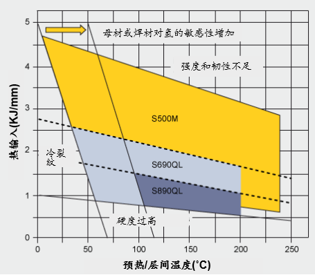 圖3顯示了焊接后從800°C到500°C的冷卻時(shí)間(ΔT8/5)對(duì)焊縫熱影響區(qū)(HAZ)性能的強(qiáng)烈影響。盡管在非常短的冷卻時(shí)間內(nèi)碳含量控制著了馬氏體的硬度,但碳當(dāng)量(CE)決定了冷卻過程中何時(shí)形成馬氏體。隨著CE的增加,臨界ΔT8/5會(huì)變長,并處于板材現(xiàn)場(chǎng)焊接所用的SMAW和MAG焊接工藝典型的工作條件范圍內(nèi)。CE較高的鋼種需要特殊的焊接預(yù)防措施,包括對(duì)焊接區(qū)域進(jìn)行預(yù)熱。隨著CE的增加,工藝處理窗口變窄(圖4)。焊接熱輸入過多會(huì)降低強(qiáng)度和韌性,而熱輸入過少會(huì)導(dǎo)致硬度過高,并增加熱影響區(qū)的冷裂風(fēng)險(xiǎn)。