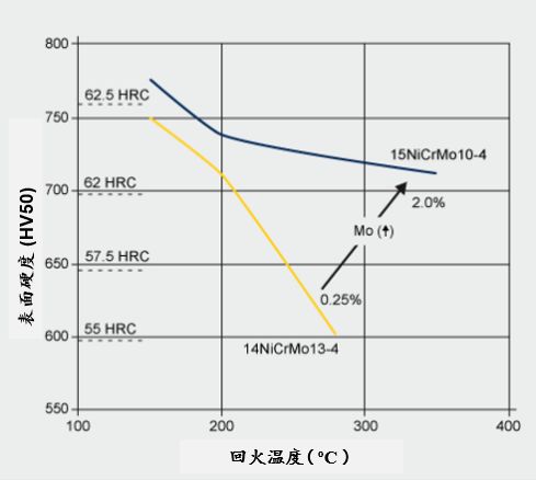 當標準滲碳鋼回火至180°C以上時,表面硬度和強度迅速下降。因此,對于關鍵應用,最高使用溫度限制在120-160°C,齒輪冷卻變得非常重要。通過大幅增加Mo含量,以及添加Nb(可選項),鋼的回火抗性大大提高。圖2顯示了添加2%Mo而不是標準0.25%的效果。即使在300℃回火后,提高Mo含量也會產生超過700HV(60HRC)的表面硬度。
