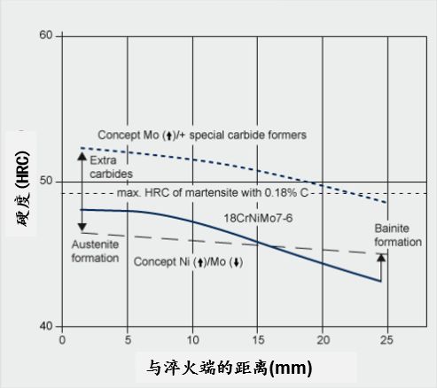 圖1 兩種改進的18CrNiMo7-6鋼(實線)的末端淬透性試驗結果,說明了添加Mo如何改善風力發電機齒輪箱的性能。