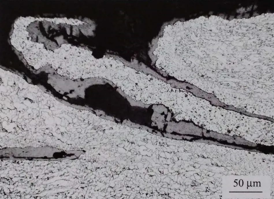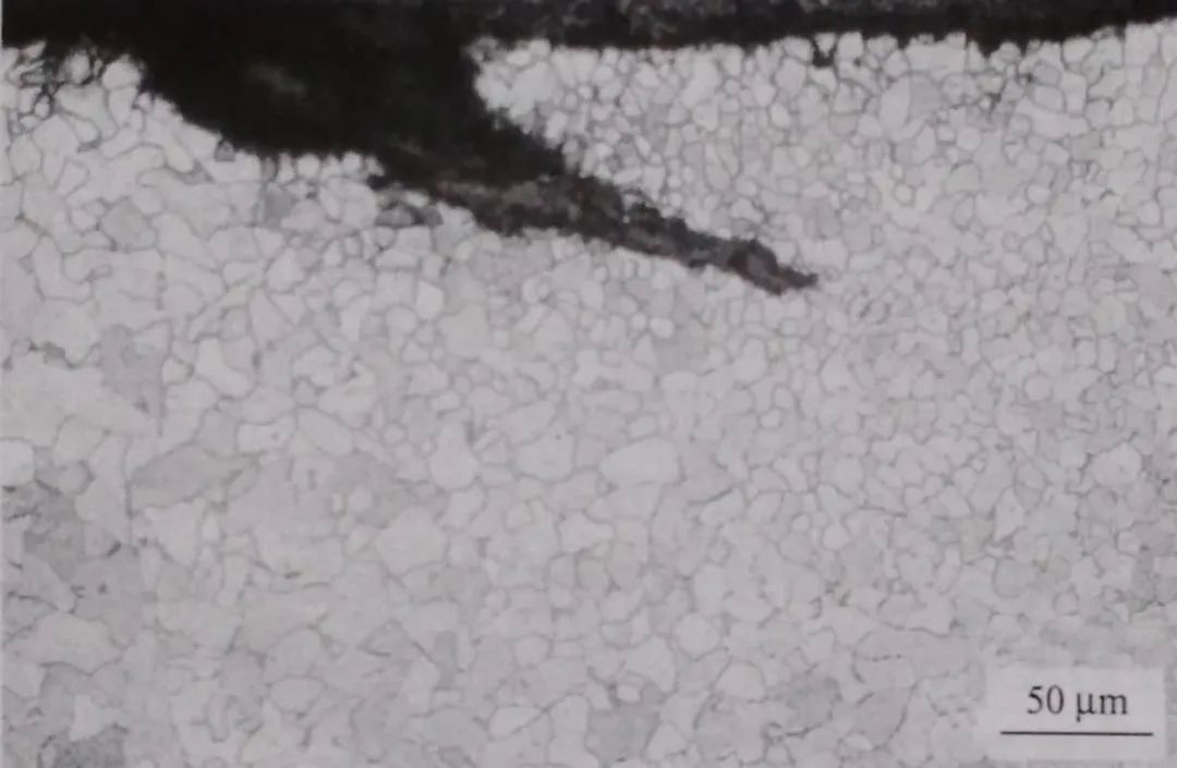 取鋼板截面試樣觀察,缺陷在截面表層呈裂紋形態,深度為0.3~0.8mm。高溫長時間氧化的特征十分明顯、裂紋內側有氧化鐵,一側有大量密集分布的氧化圓點。該類氧化圓點比較粗,放大200 倍下就能觀察到,與軋鋼裂紋周圍細小稀疏的氧化圓點有明顯區別,它是缺陷附近鋼基經高溫加熱氧化的產物。裂紋按形態分為兩類:一類呈粗大的半網狀(圖1-47) : 另一類呈折疊形態斜向伸入鋼基(圖1-48) 。經試劑浸蝕后,裂紋一側(出現氧化圓點側)組織有嚴重的脫碳(圖1-49)。根據以上特征初步判斷,缺陷在加熱軋制前就已存在,且位于板坯棱邊部或窄面。