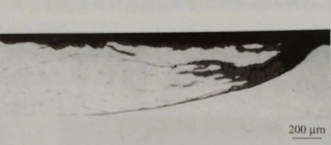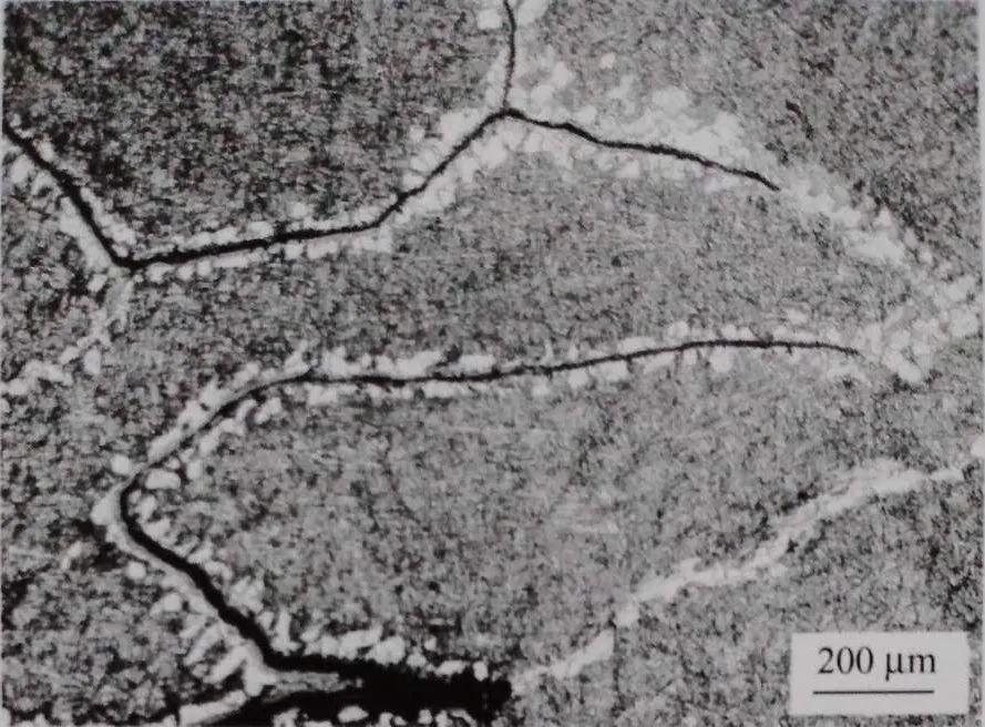 SPHC 連鑄板坯、熱軋成厚度為3mm的鋼板后,上板面出現間隔幾乎相等的周期性橫向微裂紋。用過硫酸銨水溶液擦拭板面后,裂紋特征更加明顯,呈曲線狀分布,見圖1-38。微觀特征: