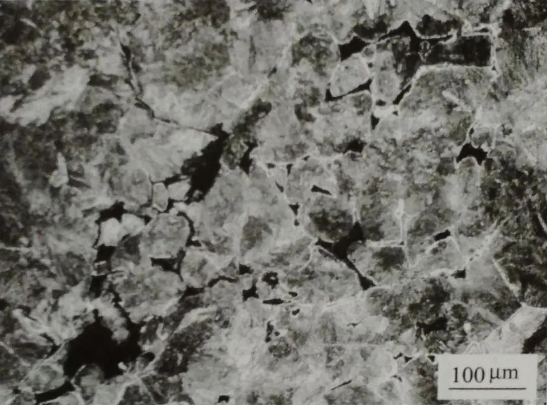 試樣用3%硝酸酒精溶液浸蝕后,正常部位組織為珠光體和網狀鐵素體。與之相比,裂紋區域珠光體量多且組織粗大,裂紋和孔隙多沿原奧氏體晶界分布,見圖1-29, 根據組織特征判斷,裂紋區域碳含量偏高(接近0.7%) 。試樣經磷偏析試劑(即奧勃氏試劑)浸蝕后,裂紋區域呈白亮色(圖1-30) 。用電子提針對金相磨面上的白亮區和非白亮區進行成分(質量分數,%) 對比分析,結果列于表1-2。表中白亮區w (P) 高達0. 22%, 說明白亮區為磷的強偏析區。表1-2 試樣白亮區和非白亮區成分對比(w/%)