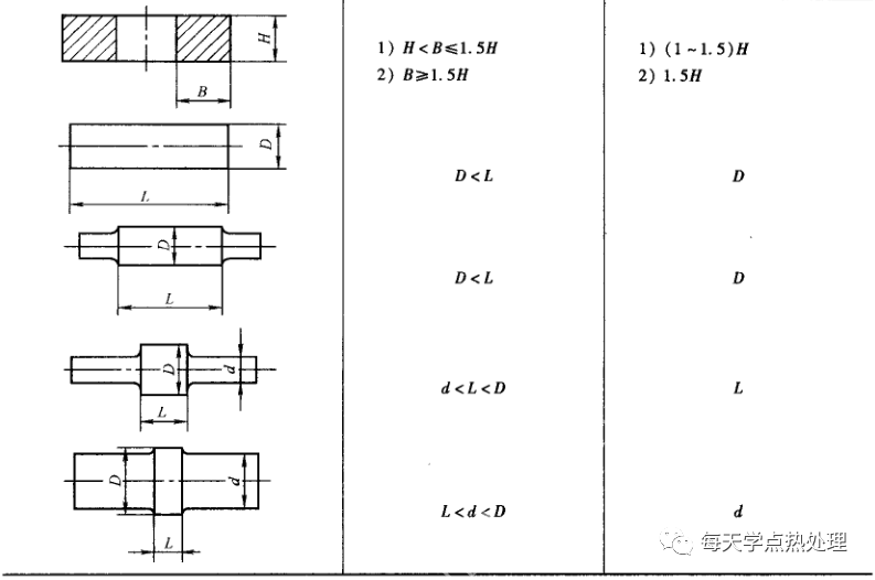 當加熱爐主要測溫儀表(一般臺車式爐指爐頂測溫儀表,井式爐指各段爐壁儀表)指示爐溫到達規定溫度時,即為均溫開始,至目測工件火色均勻并與爐墻顏色一致時為均溫終了。為使工件心部達到規定溫度、完成奧氏體轉變并使其均勻化,鍛件在均溫后尚需進行保溫。保溫時間根據工件有效截面確定。對碳素結構鋼與低合金結構鋼鍛件,保溫時間按0.6~0.8h/100mm計算。對中、高合金鋼鍛件,按0. 8~1h/100mm計算。各種形狀鍛件有效截面計算方法見表2 。