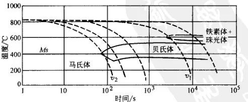 不小于υ1終冷溫度不高于450°C。如要使鍛件心部獲得馬氏體組織,必須保證鍛件心部冷卻速度不低于υ2, 且應過冷到300℃以下。在確定終冷保持時間時,必須充分考慮組織轉變熱效應的影響。