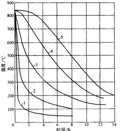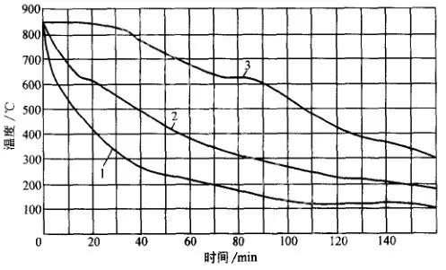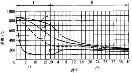 空冷或鼓風冷的冷卻能力比水冷、油冷小得多,故在一定程度內可避免鍛件內部缺陷的擴大,但空冷時鍛件的性能潛力不能充分發揮。圖12 、圖13 是大鍛件的空冷曲線。