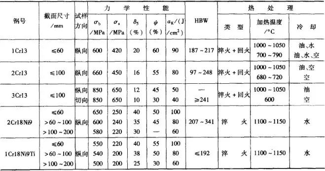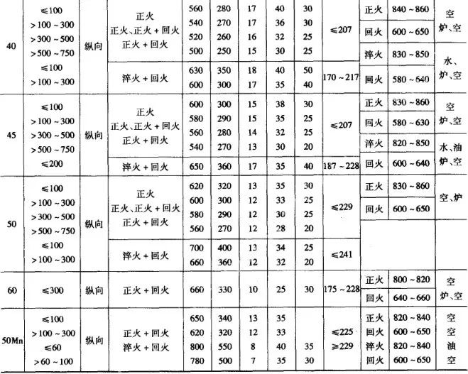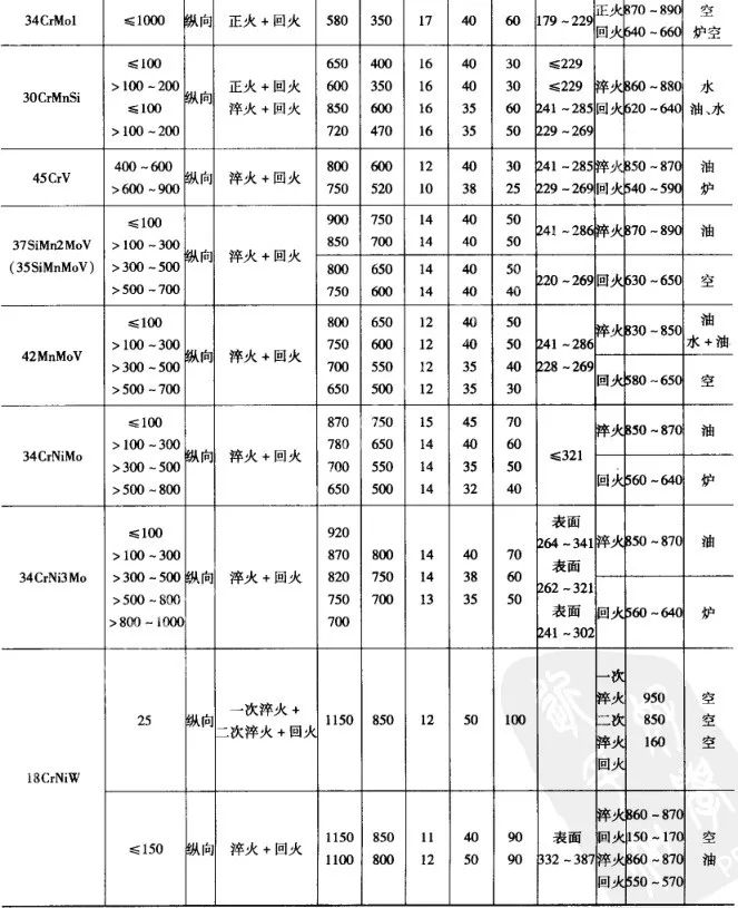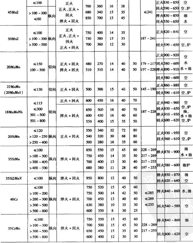 常用的不同截面的優質碳素鋼、合金結構鋼大型鍛件,在調質處理后的力學性能列表8 和表9 ,不銹鋼和耐酸鋼鍛件熱處理后的力學性能見表10。各表中的性能數據皆指軸類鍛件在距表面1/3半徑處切取縱向試樣的性能。
