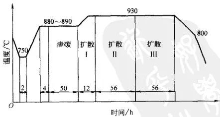 為了防止齒輪表面硬化層被壓碎和防止齒面剝落,大型重載齒輪的滲碳層深度應為齒輪模數的0.15~0.25倍,并保證在硬化層過渡區中切應力與抗剪強度之比不大于0.55。為使齒輪具有較高的接觸疲勞強度和彎曲疲勞強度,齒輪表層碳的質量分數應控制在0.75%~0.95%之間。經最終熱處理后,對齒輪表面硬度要求分為4級:58~62HRC、55~60HRC、54~58HRC和52~56HRC, 心部硬度為30~46HRC.滲碳層中的碳化物顆粒應接近球形、直徑小于1um并且比較均勻。滲層與心部間過渡平緩,自w (C) 為0.4%處至心部組織的深度應占整個滲碳層的30%。經長時間滲碳處理后心部晶粒度不應低于6級。6.1.2 典型工藝