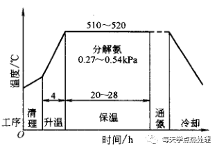 對于輕載、高速齒輪,形狀尺寸精度要求很高的齒輪和難于加工磨損件,滲氮處理是一種比較理想的工藝。典型工藝如圖23、圖24 所示:要求:滲氮層深0.4-0.45mm,表面硬度530HV10 脆性1級