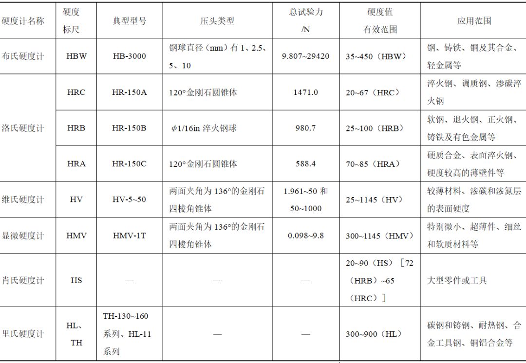 主要有布氏硬度計(jì)、洛氏硬度機(jī)、維氏硬度計(jì)、顯微硬度計(jì)、肖氏硬度計(jì)及里氏硬度計(jì)等。它們的應(yīng)用范圍有較大的區(qū)別。幾種硬度計(jì)的適用范圍和特性對(duì)比如表4所示。