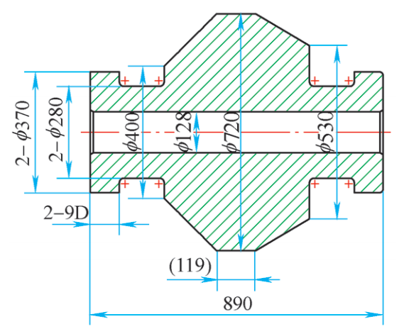 壓裂頭的形狀如圖1所示。工藝流程:鍛造成形→正火→粗加工→劃線→鉆鏜中間大孔→調(diào)質(zhì)→機加工去掉氧化皮→探傷。