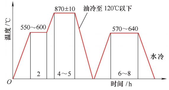 熱處理工藝如圖5所示。通過對壓裂頭進行取樣分析,發(fā)現(xiàn)壓裂頭力學(xué)性能、微觀組織及晶粒度均滿足技術(shù)要求。