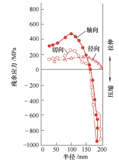 原蘇聯(lián)聶姆琴斯基做了大量的試驗,對于非淬透性鋼,在油淬后測得殘余應(yīng)力與直徑的關(guān)系,如圖7所示。應(yīng)力的作用方式和大件淬裂產(chǎn)生的力學(xué)模型如圖8所示。