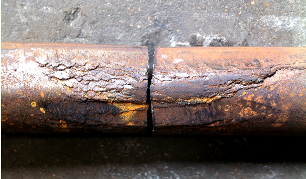 我公司的原材料均是由定點廠家供貨,由于有一段時間生產(chǎn)量大,定點廠家供貨不及時。為了滿足生產(chǎn)需求,從市場上購進(jìn)一批直徑40mm的40Cr圓鋼,進(jìn)貨檢驗化學(xué)成分及力學(xué)性能也在標(biāo)準(zhǔn)要求范圍內(nèi)。按工藝流程投入到機加工車間正常生產(chǎn),在車總長、鉆中心孔時操作工發(fā)現(xiàn),16019FT半軸桿部中段有約100mm的表面折疊,且嚴(yán)重失圓。操作工將該工件挑選出來放到地上,半軸立即斷為兩截(見圖1)。對斷裂件宏觀觀察,斷口截面90%的面積氧化嚴(yán)重,只有約10%的面積為新斷口。該半軸桿部未進(jìn)行任何加工處理,可以判定原材料已存在裂紋(見圖2)。